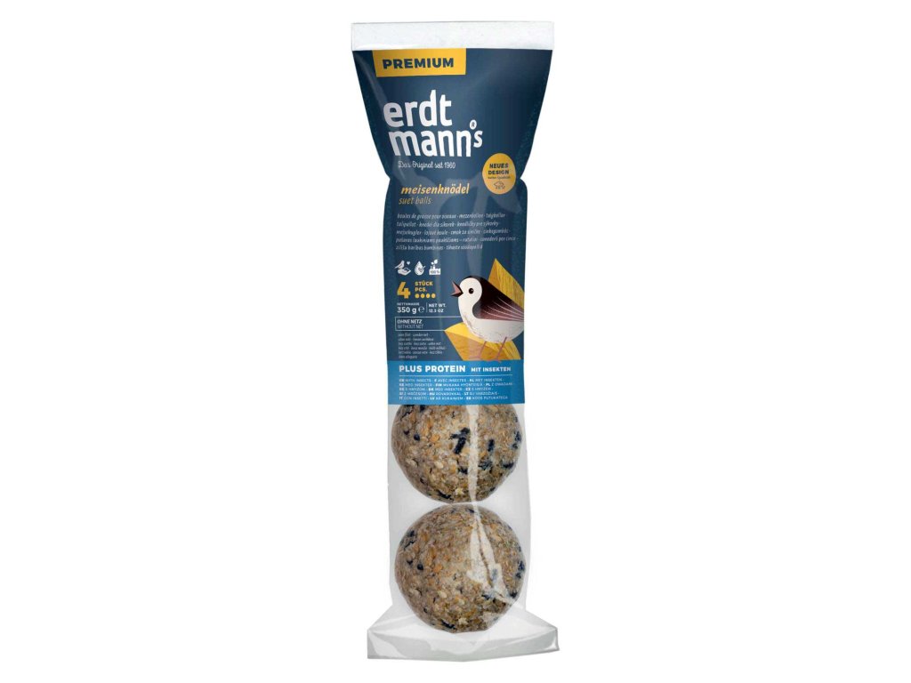Prémiové koule z řady PLUS s přídavkem obzvlášť výživově cenných složek pro ptáky: sušených a mletých moučných červů a kobylek.